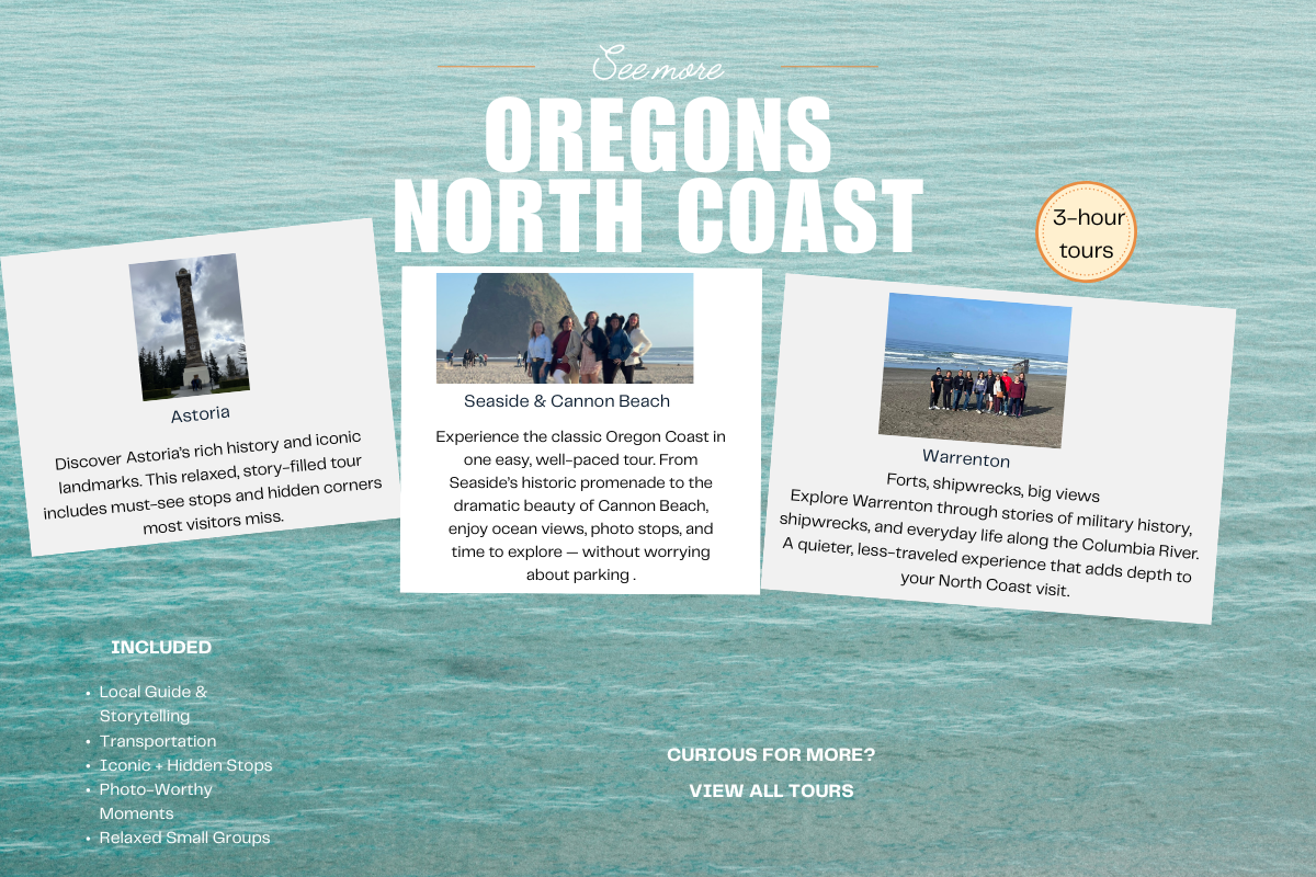 Explore history, film sites, and coastal beauty with Onward Adventures — locally guided tours designed for curious travelers. From Astoria’s riverfront to Cannon Beach’s iconic Haystack Rock, your next great story starts here.